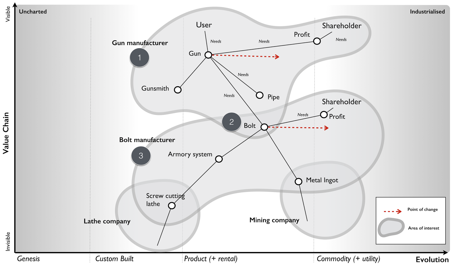 Of course, meeting those needs requires many components, i.e., an entire supply chain (of physical, technological, data and practice components) is necessary to make it happen. Since those components are all evolving we need to do several things. We need to understand what the components are, the relationships between components, how this connects to use needs, and how evolved those components are. How you manage, purchase, finance and build a totally novel and new concept that has never been done before is radically different from how you manage, purchase, finance and build a highly industrialised commodity. If someone says to you that "we should use agile everywhere" or "we should use six sigma everywhere" then they are either inexperienced or a management consultant trying to flog you their latest fad. Either train them or show them the door.