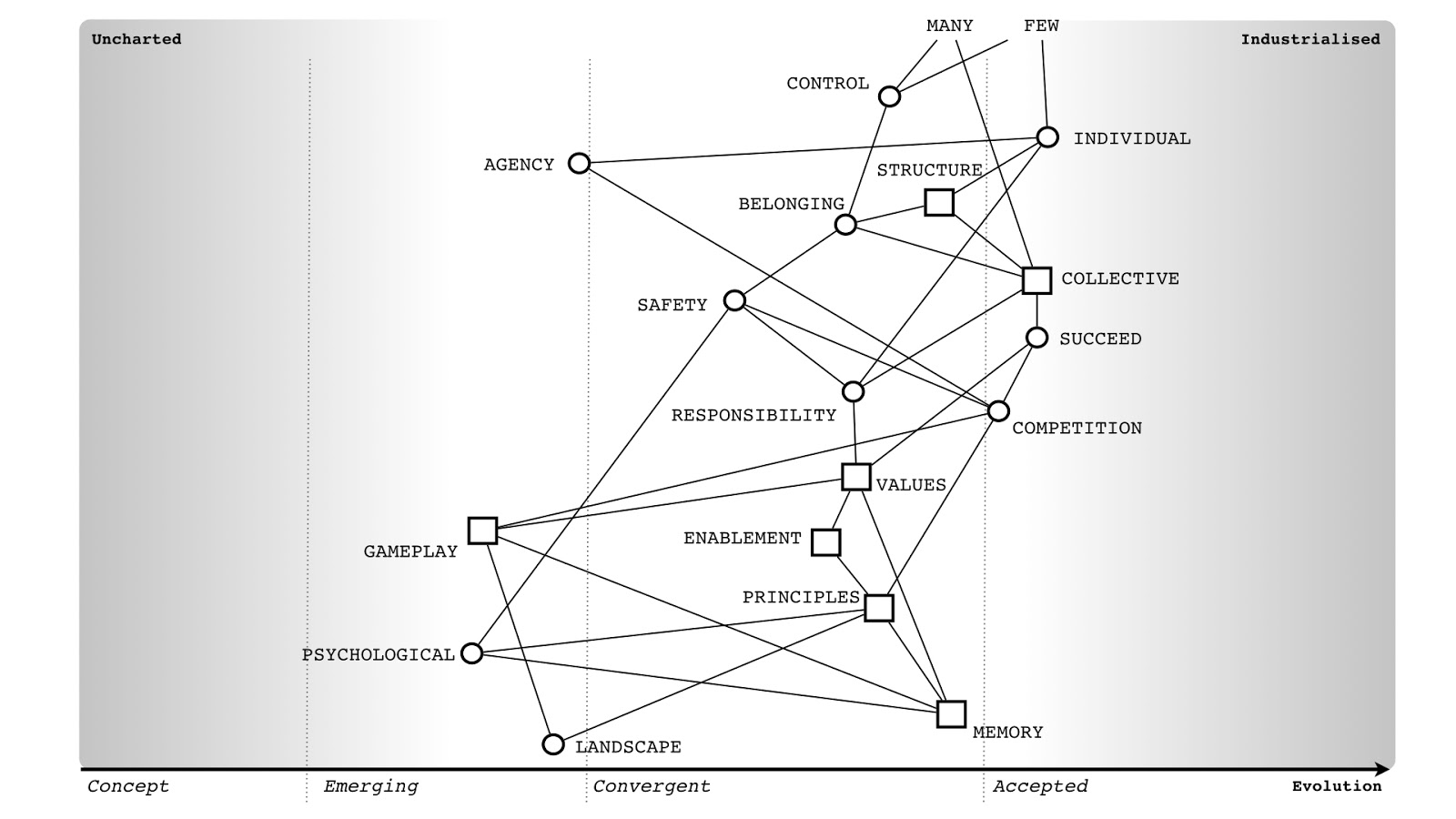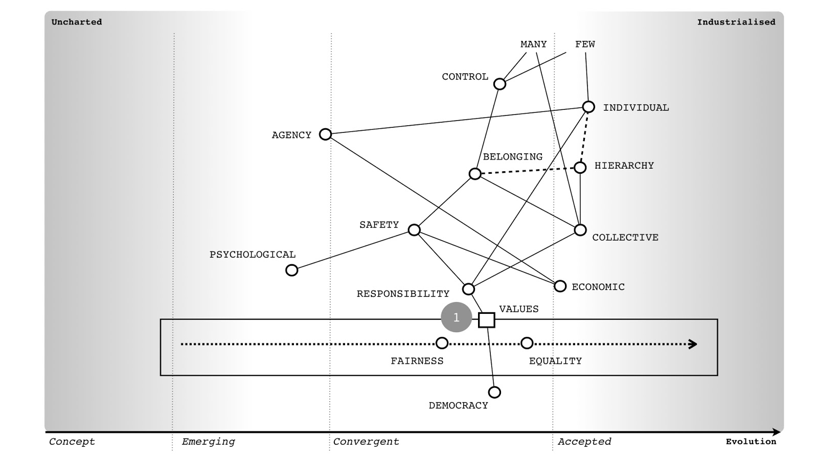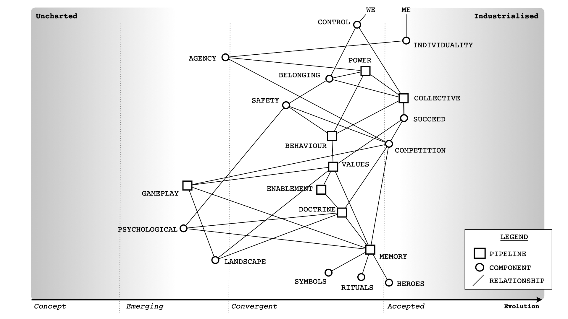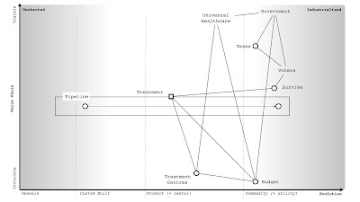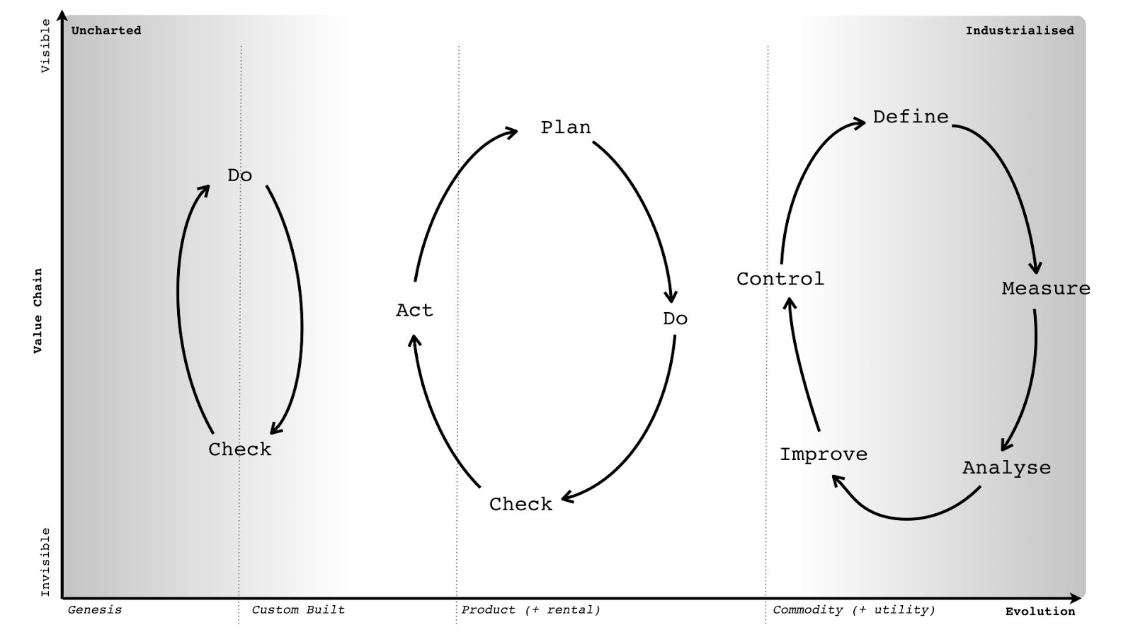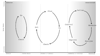Of course, meeting those needs requires many components, i.e., an entire supply chain (of physical, technological, data and practice components) is necessary to make it happen. Since those components are all evolving we need to do several things. We need to understand what the components are, the relationships between components, how this connects to use needs, and how evolved those components are. How you manage, purchase, finance and build a totally novel and new concept that has never been done before is radically different from how you manage, purchase, finance and build a highly industrialised commodity. If someone says to you that "we should use agile everywhere" or "we should use six sigma everywhere" then they are either inexperienced or a management consultant trying to flog you their latest fad. Either train them or show them the door.