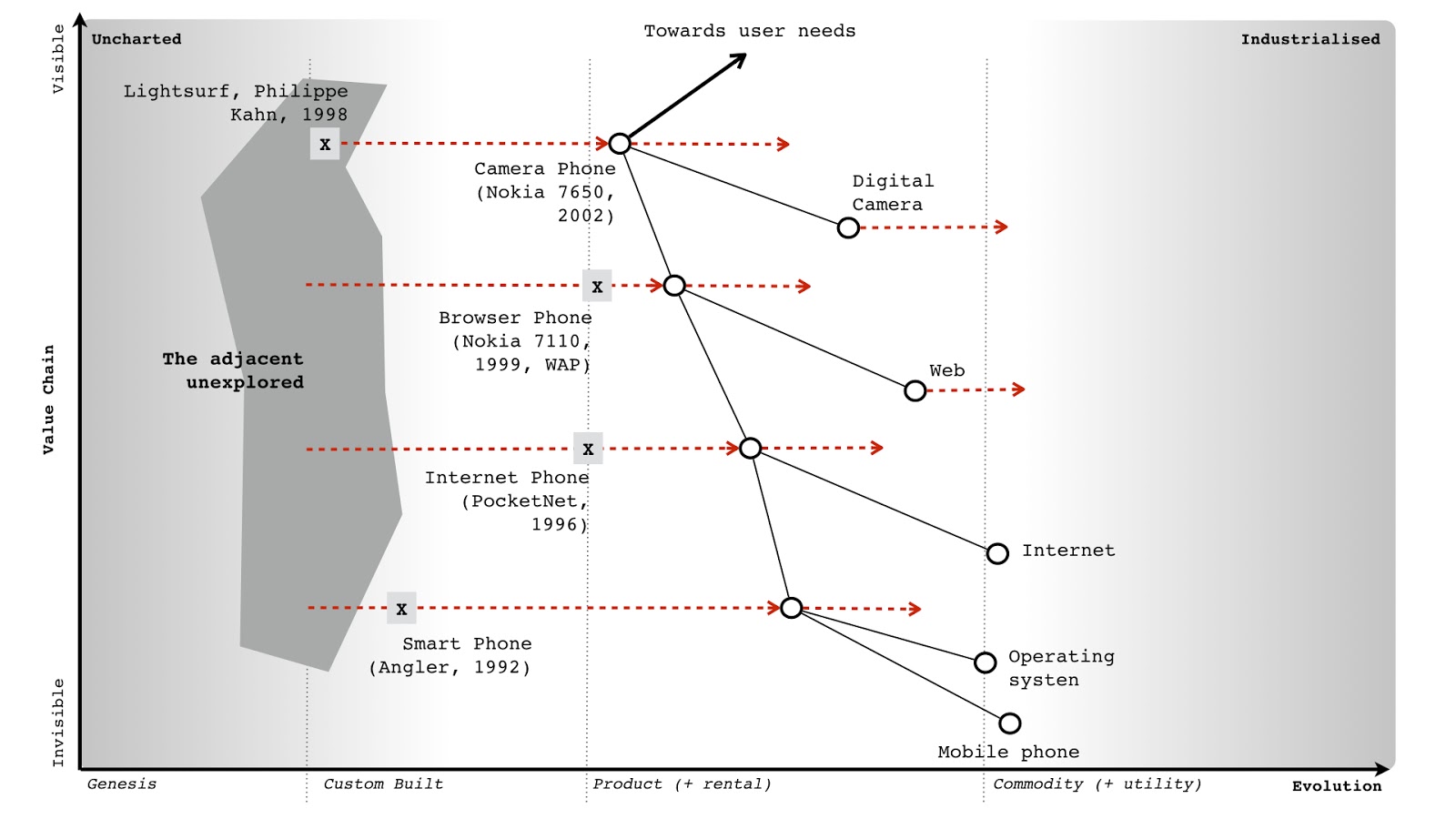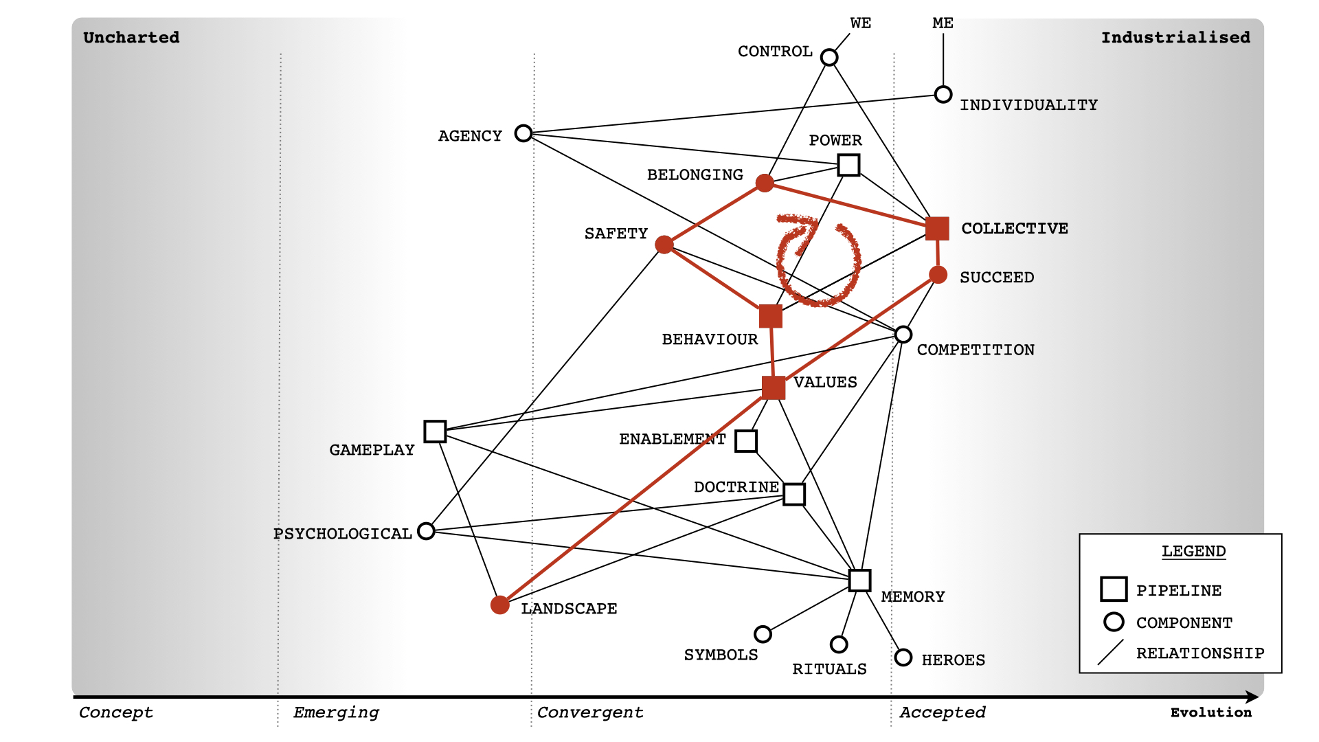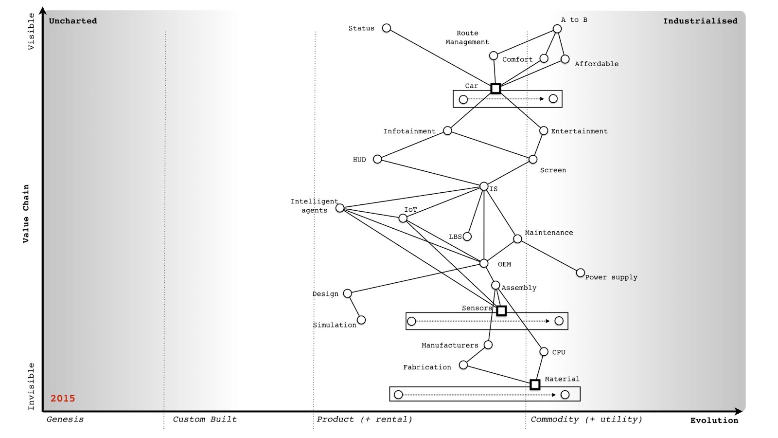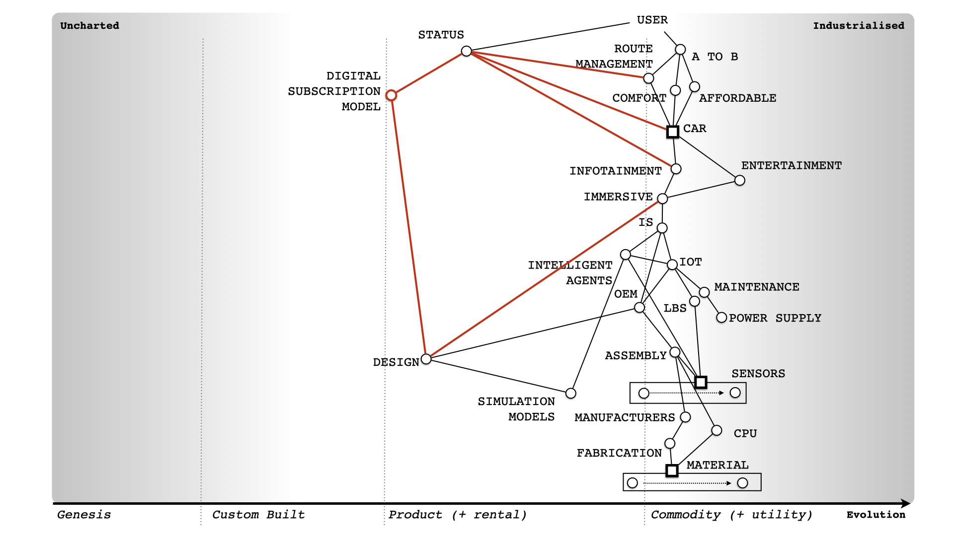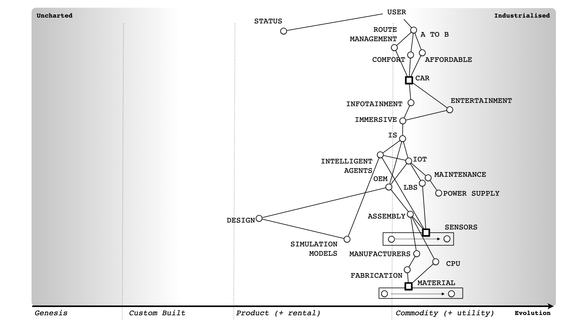 To recap, we need to understand the details and what is being considered (how evolved this). I've added that to figure 5. This is a Wardley Map.