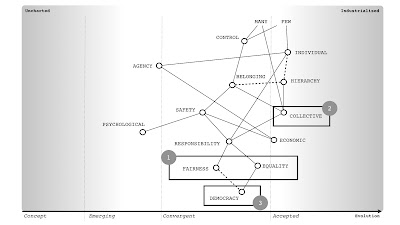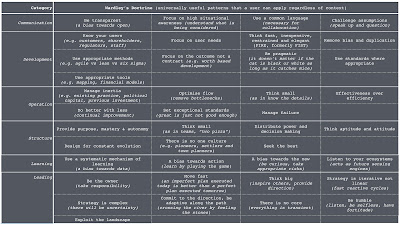 The other low-hanging fruit is contract structure. Big outsourcing projects tend to fail because we try to cover an entire project with a single contract structure whilst that project contains multiple components at different stages of evolution. The problem is you can define the industrialised components well and hence use a very structured / rigid form of contract for those components. Unfortunately, the components in the uncharted space (e.g. the genesis of the novel and new to the custom-built) can't be defined. If you attempt to, you will inevitably incur massive change control costs. This is NOT a fault of lack of specification but instead trying to specify what is still evolving and changing. If you look at figure 10, by mapping it and applying appropriate methods, you've already neatly broken it into ten different contracts with defined interfaces for which appropriate contract structures can be applied.