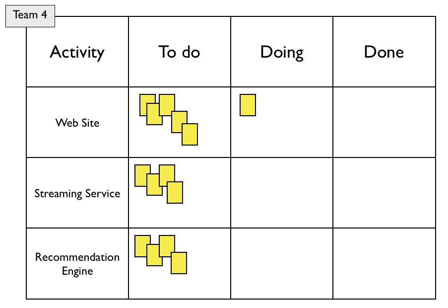 From the map, we have already identified the user need (the “visible” elements at the top of the map), we know the components involved in creating those needs (the value chain), we’ve got some idea of the context and how evolved the components are and we’ve challenged the map by identifying any bias we might have in the treatment of components. We’ve worked out that other groups have built several components and these are things we should consume from them. We’ve also agreed with other groups that several components (streaming engine, recommendation engine) we could look to provide.