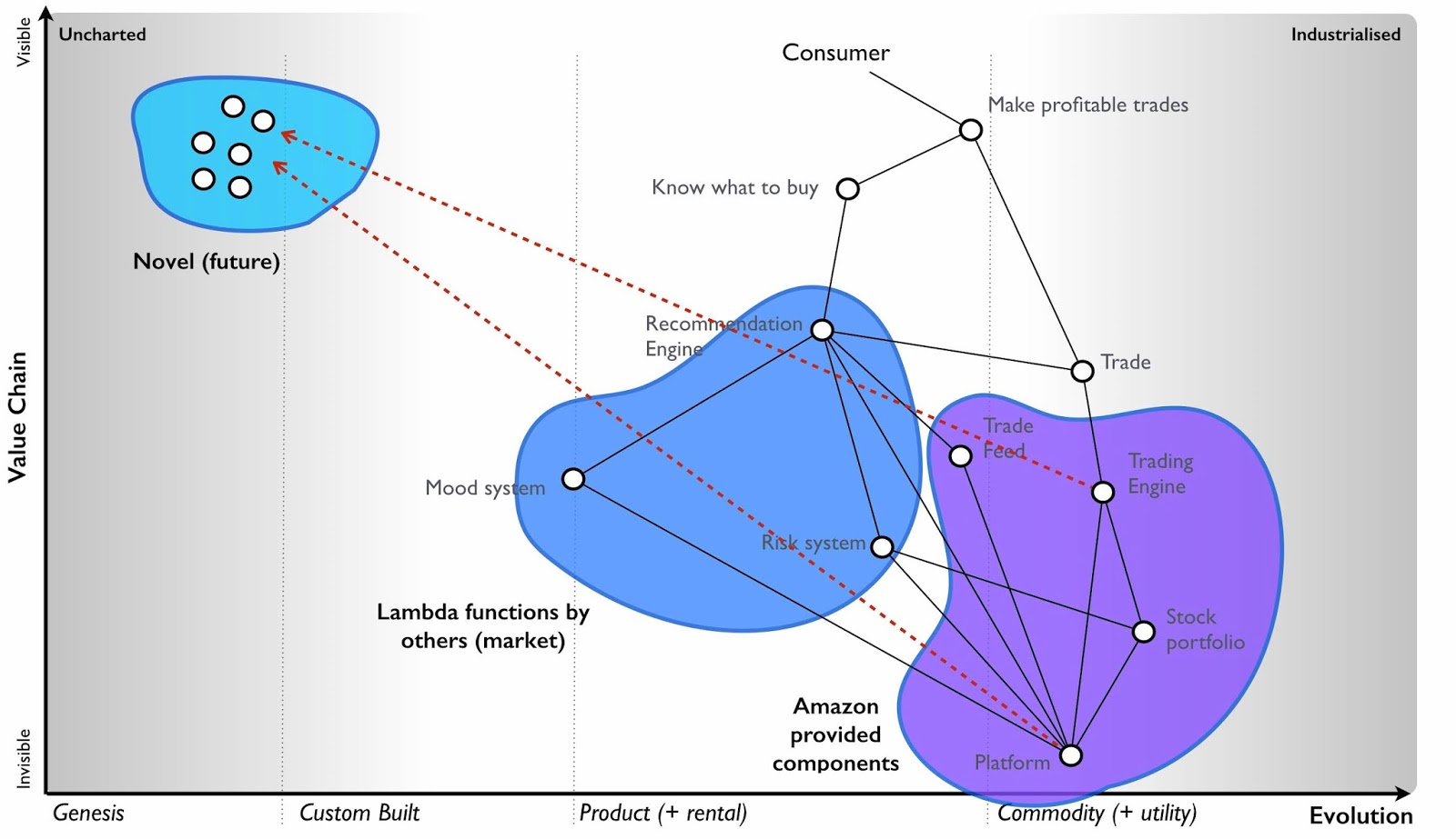So when I look at my trading system, then as time goes on then not only will more and more of the components be provided by the AWS marketplace but if AWS is playing an ILC game then many will become industrialised components provided by AWS itself. The marketplace will just be future potential AWS components and on top of this, all the novel exciting stuff (which is directly giving early warning to AWS through consumption data) is just future market components. I've shown an example of this in the map below.