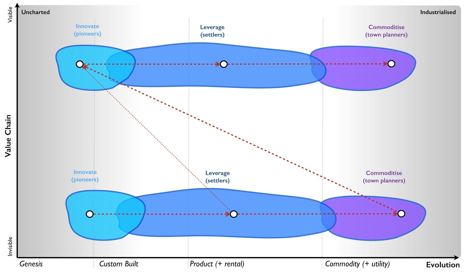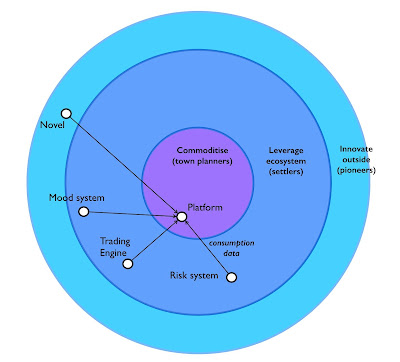 To explain why, I have to introduce you an old favourite (a decade old ecosystem model) known as innovate - leverage - commoditise. The model is fairly simple, you start off with something novel and new (which is why you need pioneers), as it evolves then you leverage any pattern that is discovered to produce a useful product or library routine (for this you need a different culture, a group of settlers) and eventually the thing will evolve becoming more industrialised (which requires a focus on commoditisation and a different culture known as town planning).