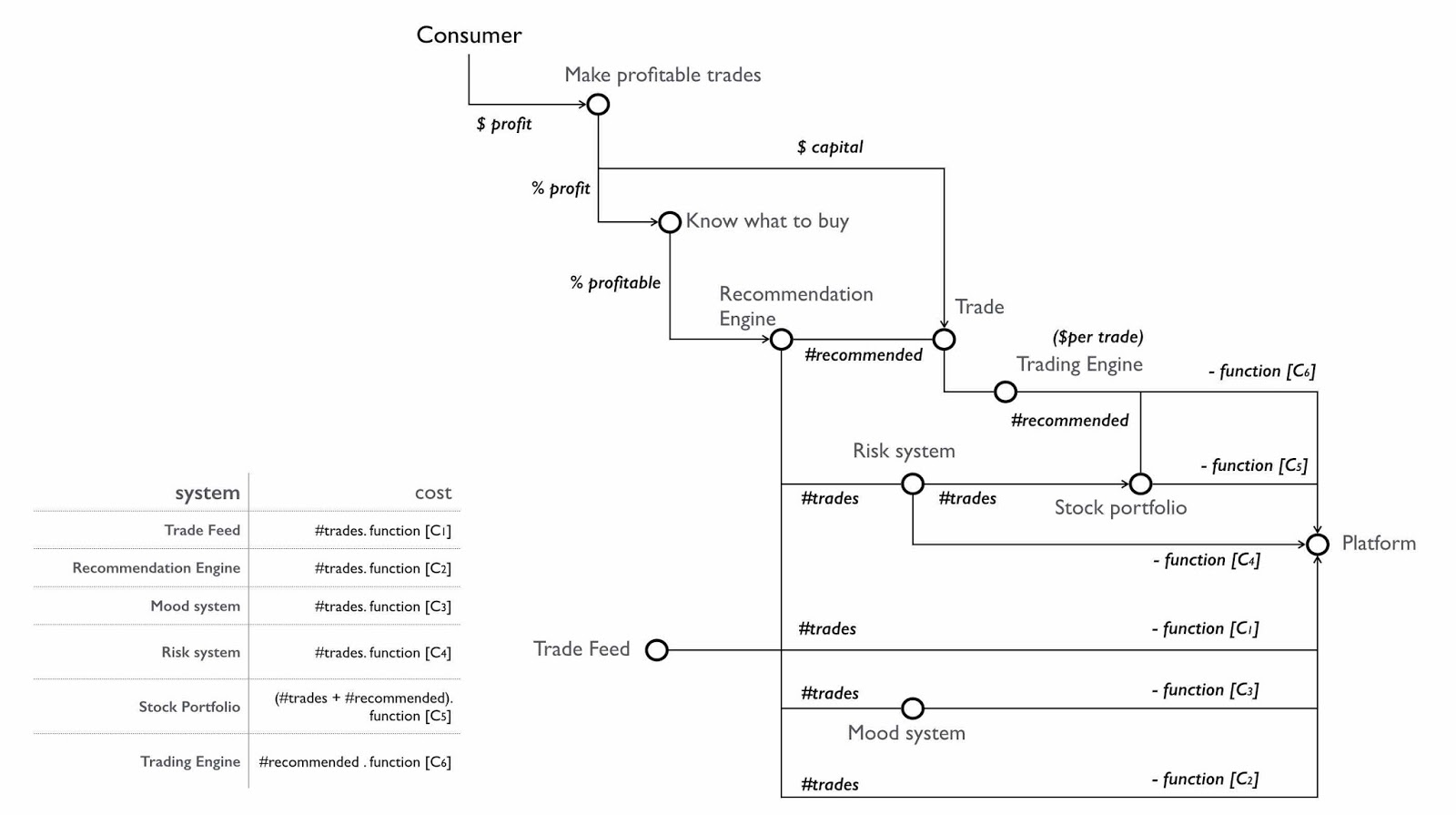 So, we've got our hypothetical trading system to which I've also added some metrics. I'm now going to turn this map into a flow and add the metrics. From below, the trade feed creates the list of trades and is governed by the number (#) of trades. The trade feed is a Lambda function and so there is a cost to it. Each trade is run through the risk, mood and finally recommendation system - each creating their own functional costs. The recommendation system provides a list of recommended trades (#recommended) which impacts the trading engine and the stock portfolio system.